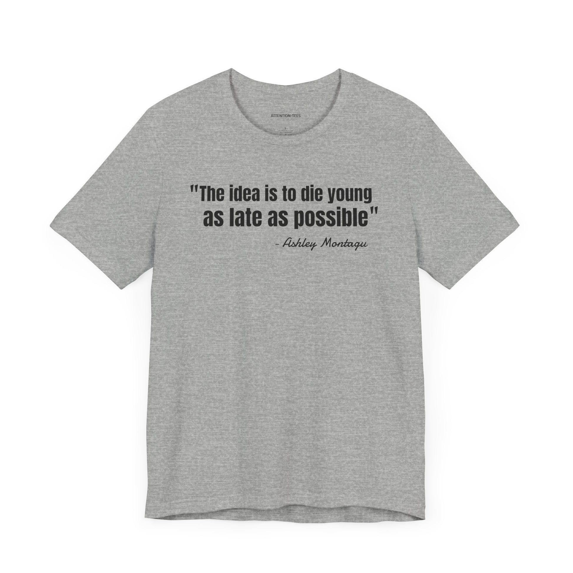 A philosophy we can get behind! Celebrate a life full of vitality with our 'The Idea Is to Die Young as Late as Possible' short sleeve T-shirt. Featuring Ashley Montagu’s inspiring words, this tee is perfect for those who embrace youthfulness in spirit and a zest for living.