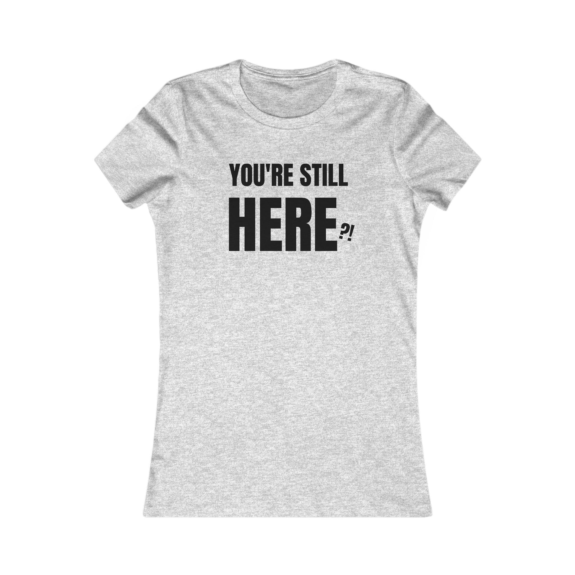 Add a touch of humor to your wardrobe with this women's cut T-shirt featuring the playful phrase "You're Still Here?!" Perfect for those who love sassy, conversational designs, this tee brings a smile and makes a clear statement.